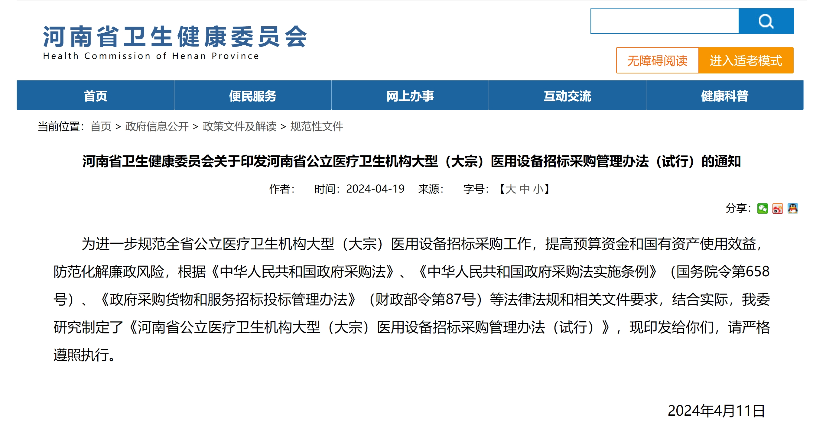 近日,河南省衛健委官網印發了《河南省公立醫療衛生機構大型(大宗)醫用設備招標采購管理辦法(試行)》(以下簡稱《辦法》),自2024年4月19日起執行。