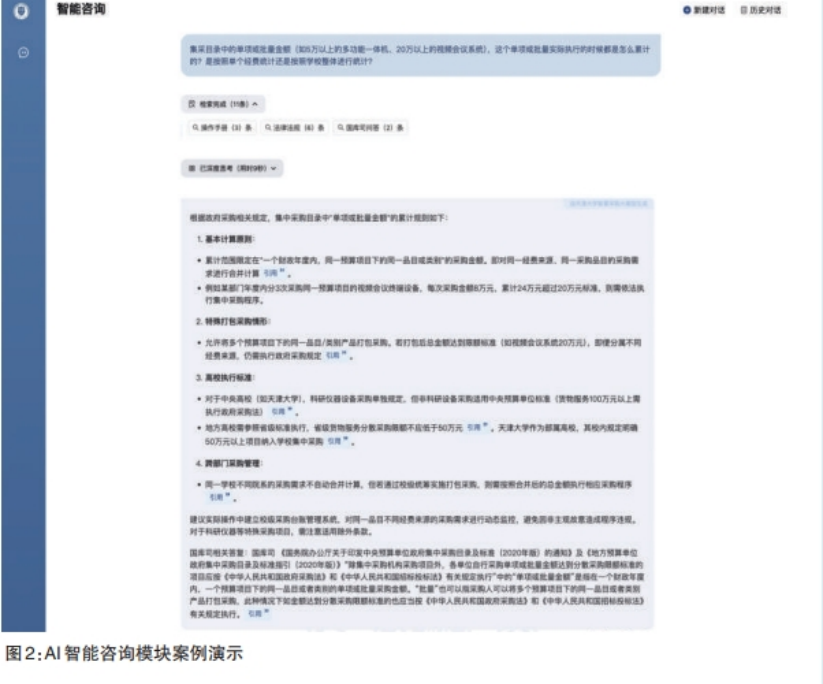 在實際應用中,智慧采購大模型展現出強大的功能。例如,當面對復雜的采購政策問題時,我們向大模型提問:“集采目錄中的單項或批量金額(如5萬以上的多功能一體機、20萬以上的視頻會議系統),在實際執行時是如何累計的?是按照單個經費統計,還是按照學校整體進行統計?”與其他常規通用模型相比,AI智能咨詢模塊不僅能迅速給出正確結論“同一預算單位、同一財政年度、同一品目”,還能精準指出特殊情形,如“高校采購科研設備時可單獨統計”,并支持溯源,引用正確的法律法規及財政部發布的權威信息。這種精準、高效且透明的咨詢服務,充分體現了智慧采購大模型在實際采購場景中的強大優勢,為采購人員和供應商提供了清晰、權威的指導,極大地提升了采購活動的規范性和效率。